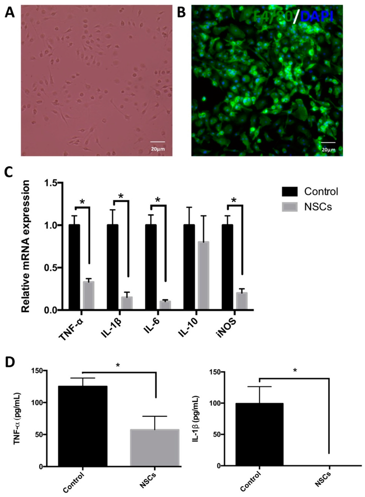 The effects of NSCs on the regulation of macrophage activation in vitro. (A,B) Mouse bone marrow-derived macrophages (BMDMs) were cultured in DMEM supplemented with 5% newborn calf serum and 15% L929 cell conditioned media for seven days in vitro. (A) A phase of the macrophage; (B) BMDMs expressed the macrophage marker F4/80 (green), and the nuclei were stained with DAPI (Blue); (C) BMDMs were cultured alone or co-cultured with NSCs by using transwells for 12 h, then incubated with 10 ng/mL IFN-γ for 12 h. Next, the mRNA levels of iNOS, TNF-α, IL-1β, IL-6 and IL-10 were detected by quantitative real-time PCR (n = 6). Results are displayed as the mean ± SD. * p < 0.05; (D) BMDMs were treated with or without NSCs for 24 h and then were induced by 10 ng/mL IFN-γ for 24 h. The BMDMs’ supernatants were collected, and the production of TNF-α and IL-1β was examined by ELISA (n = 6). Data are represented as the mean ± standard error. * p < 0.05. Scale bar = 20 μm.