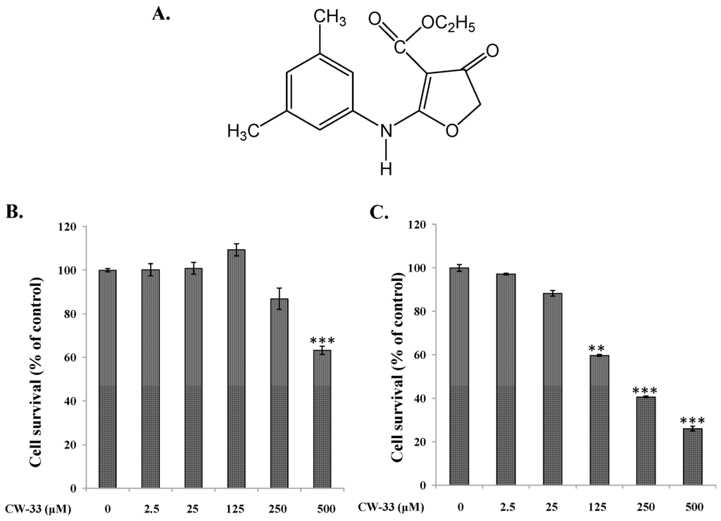 Survival rate of BHK-21 and TE671 cells in response to CW-33. The structure of CW-33 (Ethyl 2-(3′,5′-dimethylanilino)-4-oxo-4,5-dihydrofuran-3-carboxylate) is shown in (A). For antiproliferative assay, BHK-21 (B) and TE671 (C) cells cultured on 96-well plates were treated with CW-33, then incubated for 48 h, followed by MTT assay. Survival rates of cells were calculated as the ratio of OD570–630 of treated cells to OD570–630 of untreated cells. ** p value < 0.01; *** p value < 0.001 compared with mock-treated cells.