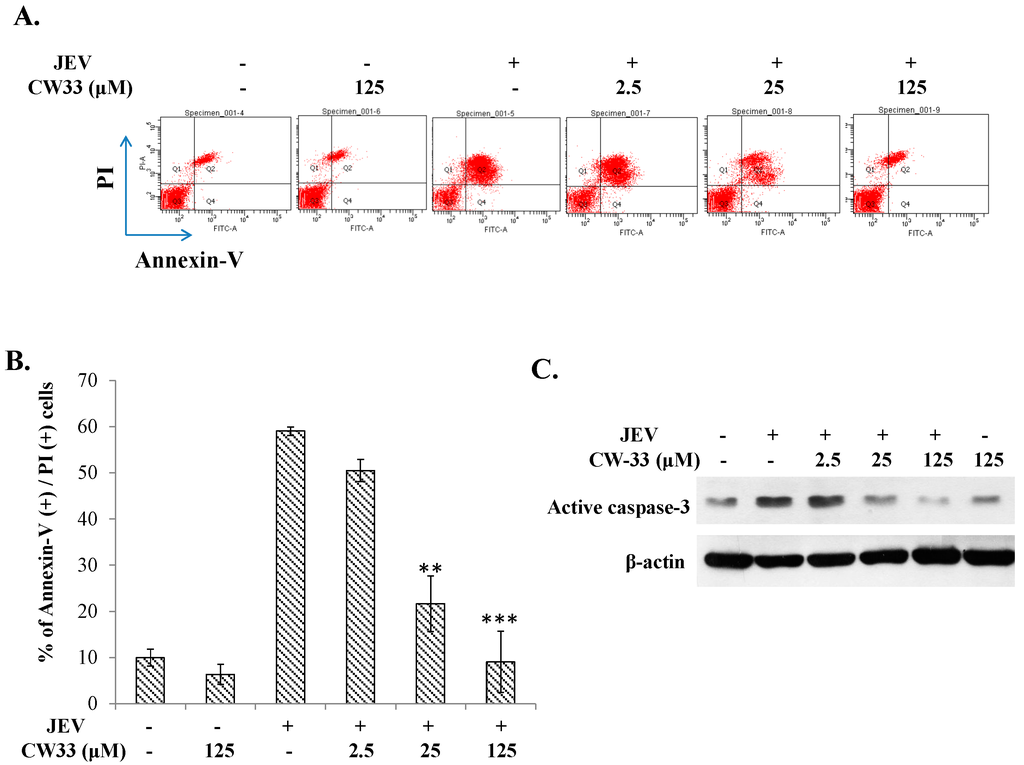 Inhibition of JEV-induced apoptosis by CW-33. TE671 cells were infected with JEV at a MOI of 0.1, and immediately treated with CW-33. Cells were harvested 36 h post-treatment, stained by Annexin V-FITC/PI dye, and then analyzed using flow cytometry (A); annexin V positive/PI positive presented as late apoptosis (B); active forms of caspases 3 in treated infected cells were characterized using Western blotting (C). ** p value < 0.01; *** p value < 0.001 compared with mock-treated infected cells.