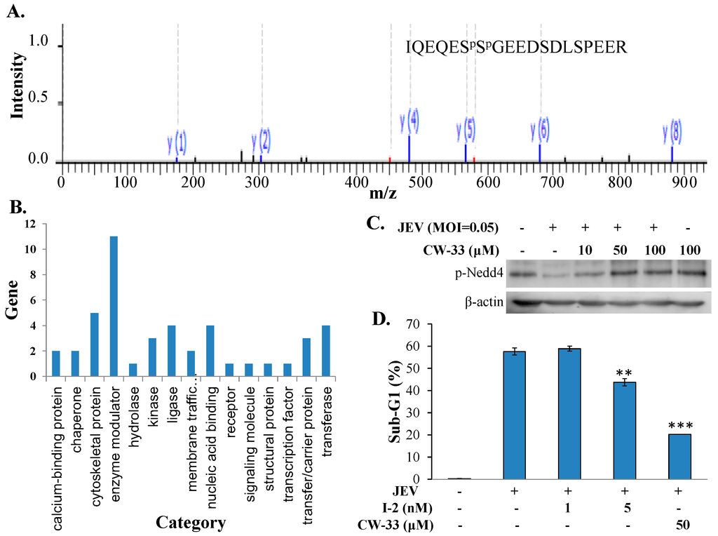 Phosphoproteome profiling of JEV-infected cells in response to CW-33. MS/MS spectrum of the phosphopeptide IQEQESpSpGEEDSDLSPEER matched in protein phosphatase 1 inhibitor 2 (I-2) is shown (A); regulated proteins identified in infected cells in response to CW-33 were categorized using PANTHER classification system (B); western blot analysis of lysates from treated and mock cells was performed; the blots were probed with anti-phospho-Nedd4 antibodies (C); infected cells were treated with I-2 for 36 h, then harvested for analyzing sub-G1 phase using PI staining (D). ** p value < 0.01; *** p value < 0.001 compared with mock-treated infected cells.
