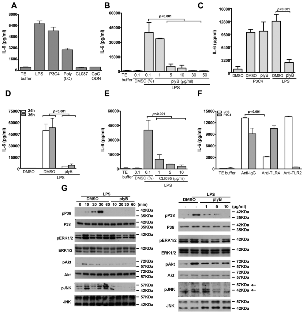 To determine the specificity of LPS action on IL-6 production, VSMCs were treated with a specific LPS inhibitor, polymyxin B , which has been reported to form a stable complex with the lipid A moiety of LPS [21]. Polymyxin B dose-dependently abolished the LPS-induced IL-6 production, but not the pam3CSK4-induced IL-6 production (Figure 1B,C). In addition, LPS-driven IL-6 production was suppressed by polymyxin B (5 μg/mL) at 24 and 36 h time points (Figure 1C,D).