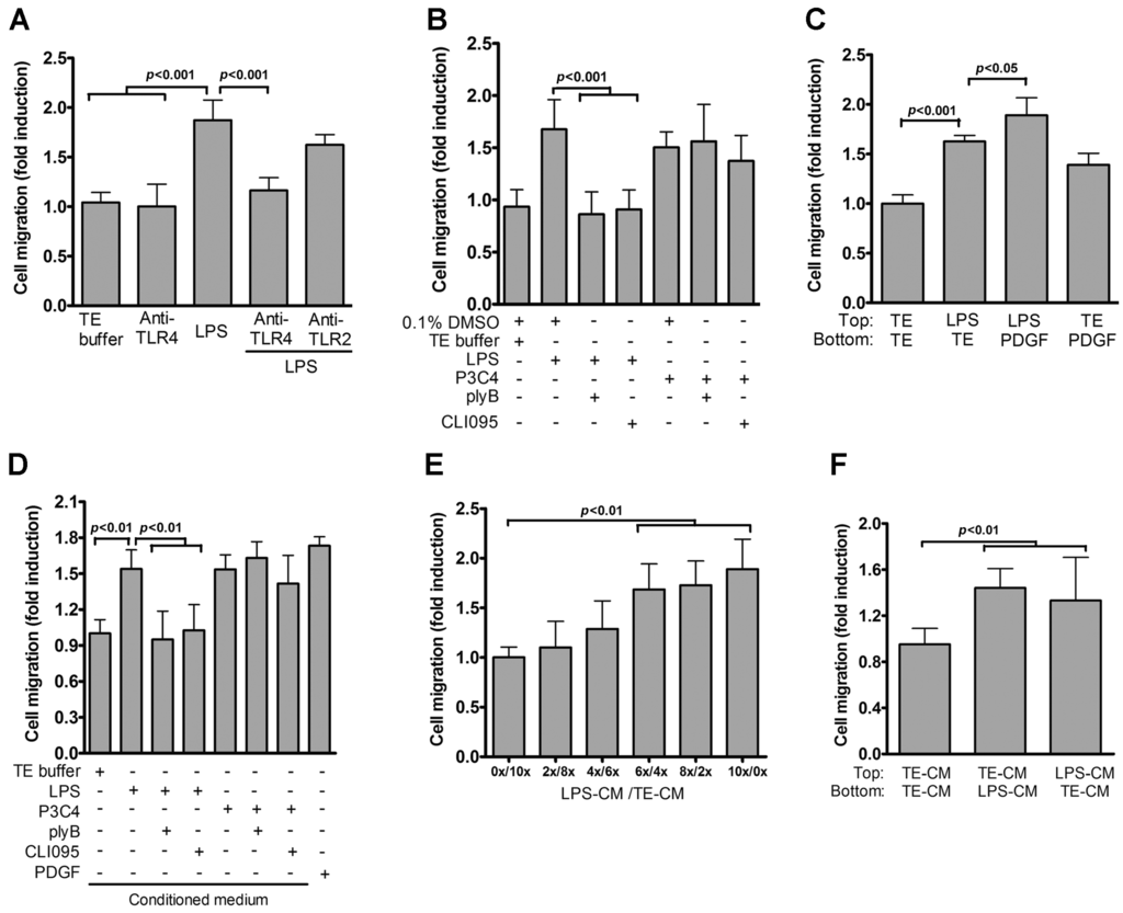 Role of TLR4 in VSMC migration. (A) VSMCs (in the presence or absence of anti-TLR2 or anti-TLR4 antibodies (5 μg/mL)) were treated with TE buffer or LPS for 24 h; (B) Quiesced VSMCs were stimulated with TE buffer, LPS or P3C4 in the presence or absence of plyB or CLI-095 for 24 h. Migration assays were then performed with PDGF-BB as a chemoattractant. p < 0.001 vs. LPS or LPS + DMSO; (C) Serum-starved VSMCs were seeded into the upper chambers of transwell plates and stimulated with TE buffer or LPS for 24 h. Migration assays were then performed with or without PDGF-BB as a chemoattractant. p < 0.001 for LPS vs. TE. p < 0.05 for LPS vs. LPS + PDGF; (D) Conditioned medium from VSMCs stimulated with TE buffer, LPS or P3C4 with or without plyB or CLI-095 for 24 h was collected and added to the lower chamber as a chemoattractant in the transwell migration assays. PDGF-BB was used as a positive control. p < 0.01 vs. LPS; (E) Serial dilutions of conditioned medium (CM) from VSMCs stimulated with LPS (LPS-CM) were prepared by diluting with TE-treated CM (TE-CM) and added to the lower chambers; VSMCs were plated onto top chambers of transwells. After 24 h incubation, VSMC migration was determined by the transwell assay. p < 0.01 vs. 0x/10x; (F) Checkerboard assays. CM from VSMCs treated with TE buffer (TE-CM) or LPS (LPS-CM) for 24 h was added either to the upper or lower chamber of the transwell plates for VSMC migration assays. p < 0.01 vs. TE-CM/TE-CM. Data in A–F represent mean ± SD of three experiments. Statistical analyses were performed using the one-way ANOVA.