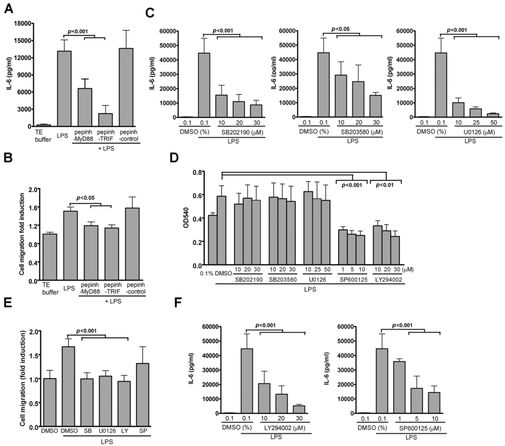 TLR4-mediated IL-6 production and VSMC migration depend on p38 MAPK and ERK1/2 pathway-mediated by Myd88 or TRIF. VSMCs were pretreated with pepinh-MyD88 (Myd88 signaling inhibitor) or pepinh-TRIF (TRIF signaling inhibitor) for 30 min, then stimulated with LPS for 24 h. (A) IL-6 levels in culture supernatants were measured by ELISA. p < 0.001 vs. LPS; (B) VSMC migration was measured by the transwell assays. p < 0.05 vs. LPS; (C–F) VSMCs were pretreated with various concentrations of the indicated inhibitors (SB202190 or SB203580 for p38; U0126 for ERK1/2; SP600125 for JNK; or LY294002 for PI3K) for 30 min and then stimulated with LPS for 24 h; (C) IL-6 levels in culture supernatants were measured by ELISA. p < 0.001 or 0.05 vs. LPS; (D) MTT assay was used to determine cell viability. p < 0.001 vs. LPS with SP600125; p < 0.01 vs. LPS with LY294002; (E) VSMC migration was measured by the transwell assays; (F) IL-6 levels in culture supernatants were measured by ELISA. p < 0.001 vs. LPS + dimethyl sulfoxide (DMSO). Data in A–F represent mean ± SD of three experiments. Statistical analyses were performed using the one-way ANOVA.