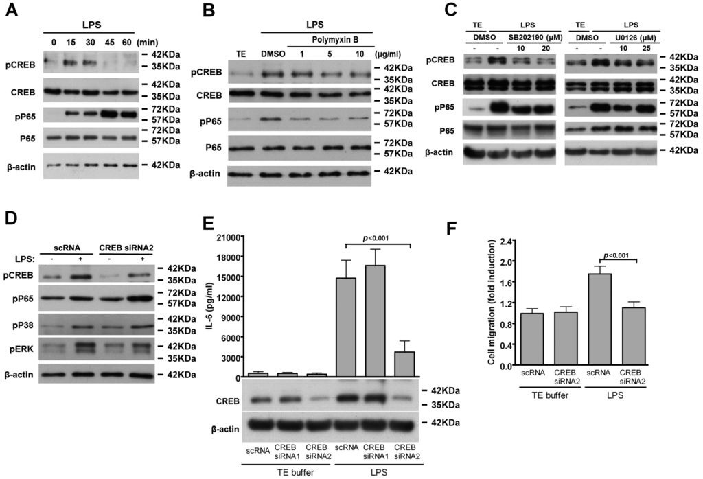 CREB-mediated IL-6 production is involved in LPS-induced VSMC migration. (A) Serum-starved VSMCs were stimulated with LPS for the indicated times; (B,C) VSMCs were pretreated with different amounts of polymyxin B (B); SB202190 or U0126 (C) for 30 min and then stimulated with LPS for 30 min. Cell lysates were subjected to Western blotting with antibodies for CREB, phospho-CREB, NF-κB p65, phospho-NF-κB p65 (Ser536) or β-actin; (D–F) VSMCs were transfected with the indicated siRNAs for 24 h and then serum depleted for 24 h; (D) Cells were incubated with LPS for 30 min. Cell lysates were immunoblotted with antibodies for CREB, phospho-CREB, phospho-p38, phospho-ERK or β-actin; (E) Cells were stimulated with LPS for 24 h and IL-6 level in culture supernatants and CREB level in cell lysates were measured by ELISA and western blot, respectively; (F) Quiesced VSMCs were incubated with LPS for 24 h and migration assays performed as in Figure 2A. p < 0.001 vs. LPS + scRNA. The experiments in A–D were repeated three times with similar results. Data in E–F represent mean ± SD of three experiments. Statistical analyses were performed using the one-way ANOVA.