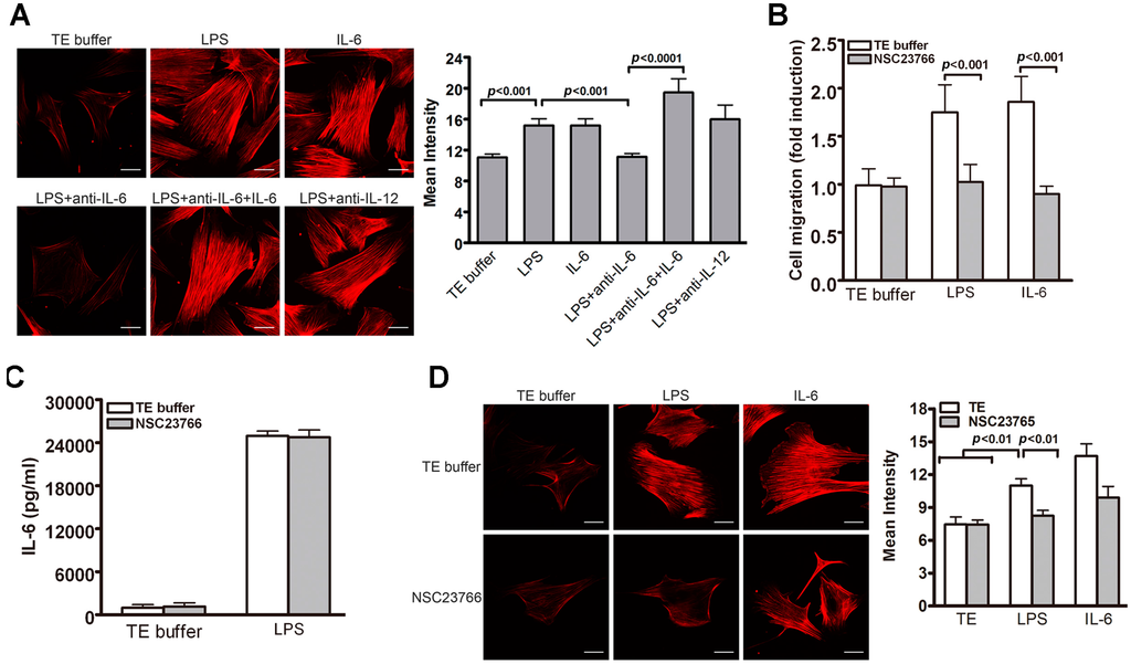 Rac1, a member of the Rho family of small GTP-binding proteins, regulates cellular migration through actin cytoskeletal structure assembly [28]. To investigate whether Rac1 participates in TLR4-induced VSMC migration, we treated VSMC with NSC23766, an inhibitor of Rac1. NSC23766 significantly reduced VSMC migration induced by LPS and IL-6 (Figure 6B) but did not inhibit LPS-induced IL-6 production (Figure 6C). In addition, LPS- or IL-6-induced actin stress fibers were significantly attenuated by NSC23766 (Figure 6D). Together, our results suggest that Rac1 plays a critical role in LPS-induced VSMC migration by inducing F-actin formation.