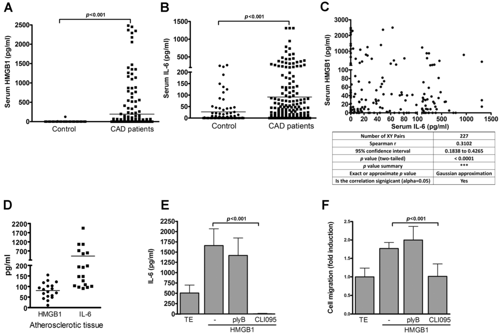 TLR4 endogenous ligand HMGB1 induces IL-6 production and VSMC migration. (A) Serum HMGB1 concentrations in CAD patients (n = 227) and healthy subjects (n = 54). p < 0.001 vs. control; (B) Serum IL-6 concentrations in CAD patients (n = 227) and healthy subjects (n = 80) were measured by ELISA. p < 0.001 vs. control. Statistical analyses in A-B were performed using the t-test; (C) Correlation between serum HMGB1 and serum IL-6 in CAD patients (n = 227). Spearman’s rank correlation coefficient (r = 0.3102, p < 0.0001). All values are expressed as means ± SD; (D) Amounts of HMGB1 and IL-6 in the atherosclerotic tissue of CAD patients were measured by ELISA; (E,F) VSMCs were pretreated with plyB or CLI-095 for 30 min, then stimulated with HMGB1 (50 μg/mL) for 24 h; (E) IL-6 levels in culture supernatants were measured by ELISA; (F) VSMC migration was measured by the transwell assays. p < 0.001 vs. HMGB1. Data in E,F represent mean ± SD of three experiments. Statistical analyses in E–F were performed using the one-way ANOVA.