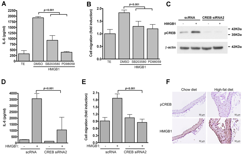 Additionally, HMGB1-induced IL-6 production and VSMC migration were suppressed by treatment with the p38 inhibitor, SB203580, and the ERK1/2 inhibitor, PD98059, suggesting that HMGB1-induced IL-6 production and VSMC migration were signaled via the TLR4-driven p38 MAPK- and ERK1/2-dependent pathways (Figure 8A,B). Since CREB activation is required for LPS/TLR4-mediated IL-6 production and VSMC migration, as demonstrated in Figure 5E,F, we next investigated whether CREB activation was essential for HMGB1-induced IL-6 production and VSMC migration. CREB siRNA2 decreased HMGB1-induced phosphorylated CREB level in the VSMCs (Figure 8C), accompanied by inhibition of HMGB1-induced IL-6 production and VSMC migration (Figure 8D,E).