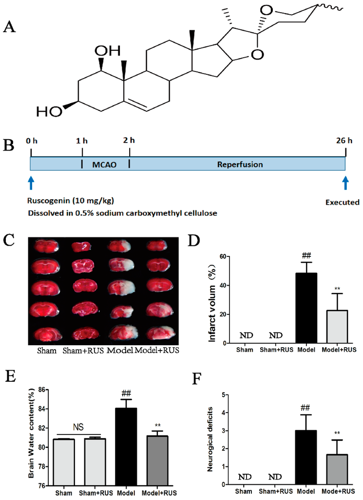 Effects of ruscogeinin on brain tissue injury in mice following MCAO/R. (A) The chemical structure of ruscogenin; (B) schematic diagram showing the experimental protocol. The experimental groups included the Sham group, Sham + RUS (ruscogenin) group, Model (MCAO/R) group and Model + RUS group. Ruscogenin was administrated intragastrically 1 h before occlusion, and the mice were reperfused after MCAO 1 h and sacrificed after a further 24 h, respectively; (C,D) representative of TTC-stained brain sections and quantitative analysis of infarct volume in different groups; (E,F) quantitation of brain water contents and neurological deficits scores in different groups. ND means “not detected”. NS means “not significant”. The data (n = 6) are expressed as means ± SD. ## p < 0.01 vs. Sham, ** p < 0.01 vs. Model.