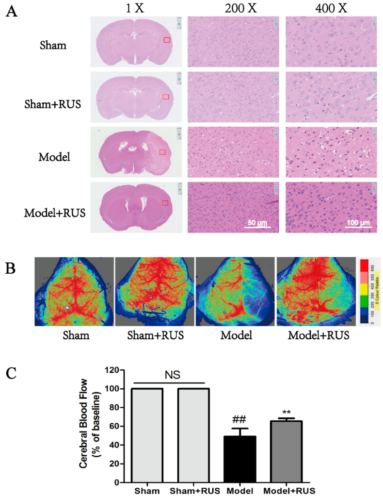 As Figure 2 shows, the hematoxylin and eosin (H & E) staining results demonstrated that the model group experienced neuronal loss and the presence of numerous vacuolated spaces; pretreatment with ruscogenin (10 mg/kg) could ameliorate histopathological damage by decreasing the cell loss compared with the model group (Figure 2A). Meanwhile, the quantification of cerebral blood flow (CBF) result showed that the administration of ruscogenin resulted in a significant increase in CBF compared with model group at 24 h reperfusion (Figure 2B,C). No obvious change was observed between Sham and Sham + RUS in the above experiments.