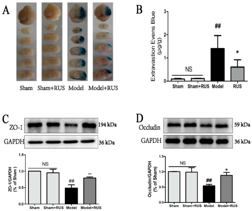 Effects of ruscogenin on BBB permeability and the expression of tight junction proteins in mice following MCAO/R. (A,B) Representative gross appearance of EB-stained brain section in mice and quantitative analysis of EB extravasation by spectrophotometry (n = 6); (C,D) representative Western blot bands and quantitative analysis of the expression levels of ZO-1 and occludin in different groups. The band intensities were measured using scanning densitometry. The data were normalized to glyceraldehyde-3-phosphate dehydrogenase (GAPDH) expression (n = 3). NS means “not significant”. The data are expressed as means ± SD. ## p < 0.01 vs. Sham, * p < 0.05, ** p < 0.01 vs. Model.