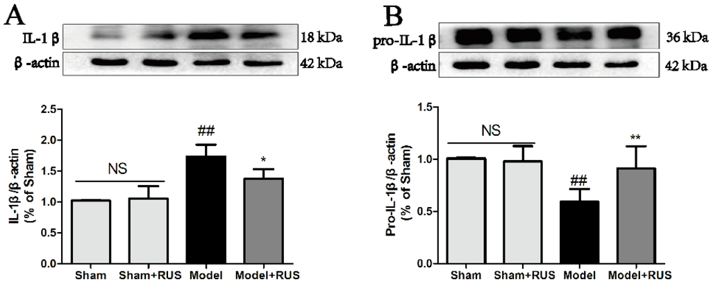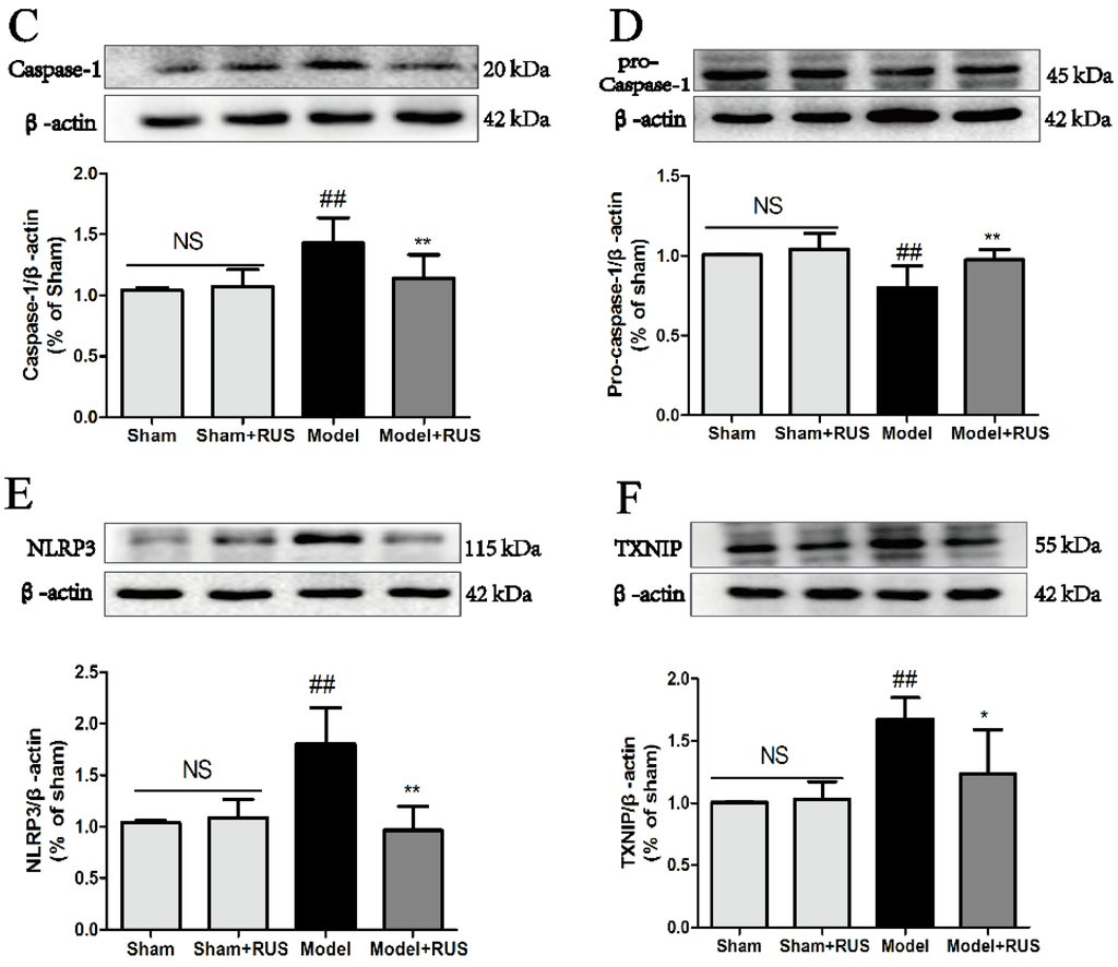 To investigate the role of the TXNIP/NLRP3 pathway in MCAO/R-induced brain injury, we further investigated the expression of IL-1β, caspase-1, and the TXNIP/NLRP3 pathway at 24 h reperfusion. The Western blot results demonstrated that pretreatment with ruscogenin could inhibit the expression of IL-1β and caspase-1, and suppress the expression of NLRP3 and TXNIP (Figure 4A–F). No obvious change was observed between Sham and Sham + RUS in the above experiments.