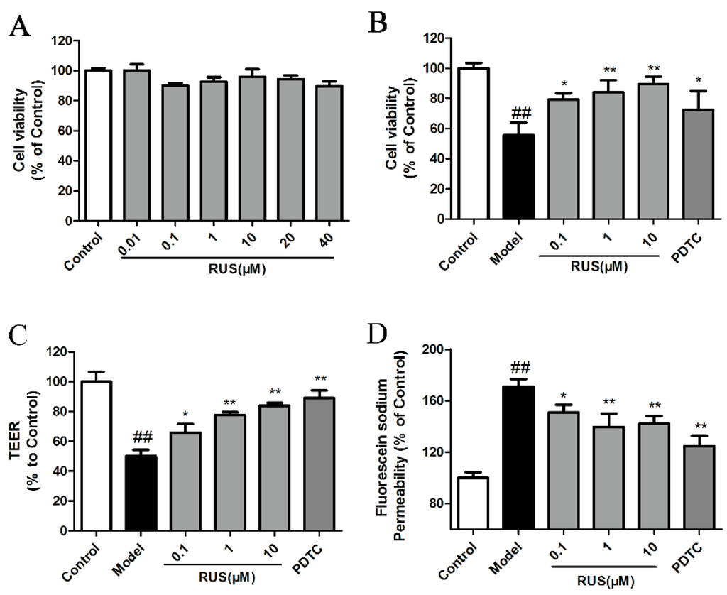 Effects of ruscogenin on the cell viability and barrier function in bEnd.3 cells subjected to OGD/R. (A,B) The bEnd.3 cells were treated with ruscogenin at various concentrations (0.01–40 µM) and the cell viability was measured using the 3-(4,5-dimethylthiazol-2-yl)-2,5-diphenyltetrazolium bromide (MTT) assay in normal conditions, or after 6 h of OGD and 18 h reoxygenation (n = 6); (C,D) the bEnd.3 cells were treated with ruscogenin (0.1–10 µM) and PDTC (10 µM), and subsequently exposed to 6 h of OGD and 18 h reoxygenation. The barrier-protection effect of ruscogenin was detected using TEER and sodium fluorescein assays. (n = 3). The data are expressed as means ± SD. ## p < 0.01 vs. Control, * p < 0.05, ** p < 0.01 vs. Model.