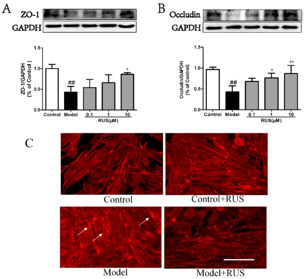 Effects of ruscogenin on the expression of tight junction proteins and actin cytoskeleton rearrangement in bEnd.3 cells subjected to OGD/R. (A,B) Representative Western blot bands and quantitative analysis of the expression levels of ZO-1 and occludin in different groups. The band intensities were measured using scanning densitometry. The data were normalized to GAPDH expression (n = 3). The data are expressed as means ± SD. ## p < 0.01 vs. Control, * p < 0.05, ** p < 0.01 vs. Model; (C) representative immunostaining of F-actin in different groups in bEnd.3 cells subjected to OGD/R; the white arrow indicates the stress fiber. Scale bars = 100 µm.