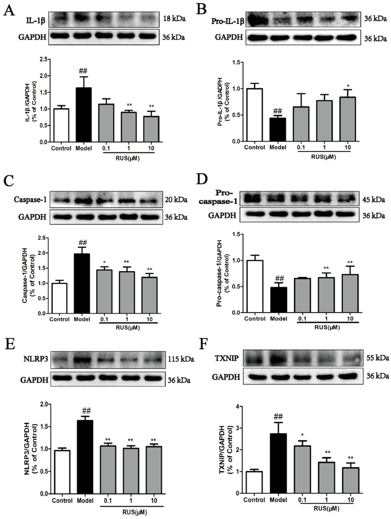 Effects of ruscogenin on the TXNIP/NLRP3 pathway in bEnd.3 cells subjected to OGD/R. (A–F) Representative Western blot bands and quantitative analysis of the ratio of IL-1β and pro-IL-1β, caspase-1 and pro-caspase-1, NLRP3 and TXNIP. The band intensities were measured using scanning densitometry. The data were normalized to GAPDH expression (n = 3). The data are expressed as means ± SD. ## p < 0.01 vs. Control, * p < 0.05, ** p < 0.01 vs. Model.