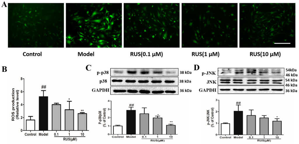 The effects of ruscogenin on ROS generation and the MAPK pathway in bEnd.3 cells after 6 h of OGD and 1h reoxygenation. (A) The intracellular ROS was viewed with fluorescence microscopy. Scale bar = 100 μm; (B) the resulting fluorescence intensity was quantified using ImageJ (National Institutes of Health, Bethseda, MD, USA); (C,D) representative Western blot bands and quantitative analysis of the ratio of p-p38/p38 and p-JNK/JNK; the band intensities were measured using scanning densitometry. The data were normalized to GAPDH expression (n = 3). The data are expressed as means ± SD. ## p < 0.01 vs. Control, * p < 0.05, ** p < 0.01 vs. Model.
