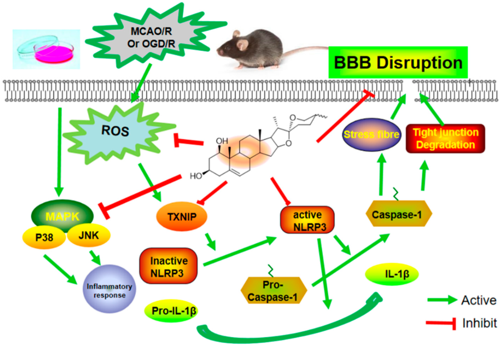 In addition, a number of studies have indicated that inflammation is a significant contributor to the pathological process of ischemic stroke [,,], and that inflammation is a major cause of BBB disruption and leads to secondary tissue injury that increases the risk of bleeding and limits tissue recovery [,]. Thus, BBB permeability is closely linked to immune response and inflammatory response in the pathological process of ischemic stroke. In particular, innate immunity is the body’s first defense against pathogenic infection and recognizes pathogen-associated molecular patterns, possibly through pattern recognition receptors (PRRs) that activate downstream signaling pathways and provide immune response and inflammatory response [,]. Among these, inflammasomes are typical PRRs found in the pathology of ischemic stroke. They can be divided into three categories: NLRPs, NLR family CARD domain containing protein (NLRC), and neuronal apoptosis inhibitor protein (NAIP). Recent research has highlighted the key role of the NLRP3 inflammasome. NLRP3-mediated inflammatory response is involved in atherosclerosis and the development of ischemic stroke, and regulation of NLRP3 inflammasome activation may play a critical role in the prevention and treatment of ischemic stroke [,,]. The NLRP3 inflammasome can activate caspase-1 and serve as a key mediator and a platform for maturation of IL-1β and other cytokines [,]. Furthermore, TXNIP, as the endogenous inhibitor and regulator of thioredoxin, which could rapidly bind to NLRP3 inflammasome, and triggering assembly and oligomerization of the inflammasome [,,]. Moreover, previous reports have demonstrated that TXNIP expression is upregulated in brain tissue after stroke in animals, and ROS induces the dissociation of TXNIP and actives NLRP3 [,]. Thus, inhibiting ROS generation and modulating the TXNIP/NLRP3 pathway might be beneficial for prevention and treatment of ischemic stroke. In our present study, we found that ruscogenin could inhibit the expression of caspase-1 and IL-1β, and suppress TXNIP/NLRP3 inflammasome activation in MCAO/R-injured mice and OGD/R-injured bEnd.3 cells (Figure 4 and Figure 7). Moreover, we also verified that ruscogenin could reduce the production of ROS and inhibit the MAPK pathway (Figure 8). All these findings demonstrated that ruscogenin ameliorated BBB disruption and might be related with suppressing the TXNIP/NLRP3 and MAPK pathways. Current studies on the inhibition of the inflammasome activation by saponins is extremely limited, thus our findings well enrich their potential application in related diseases.