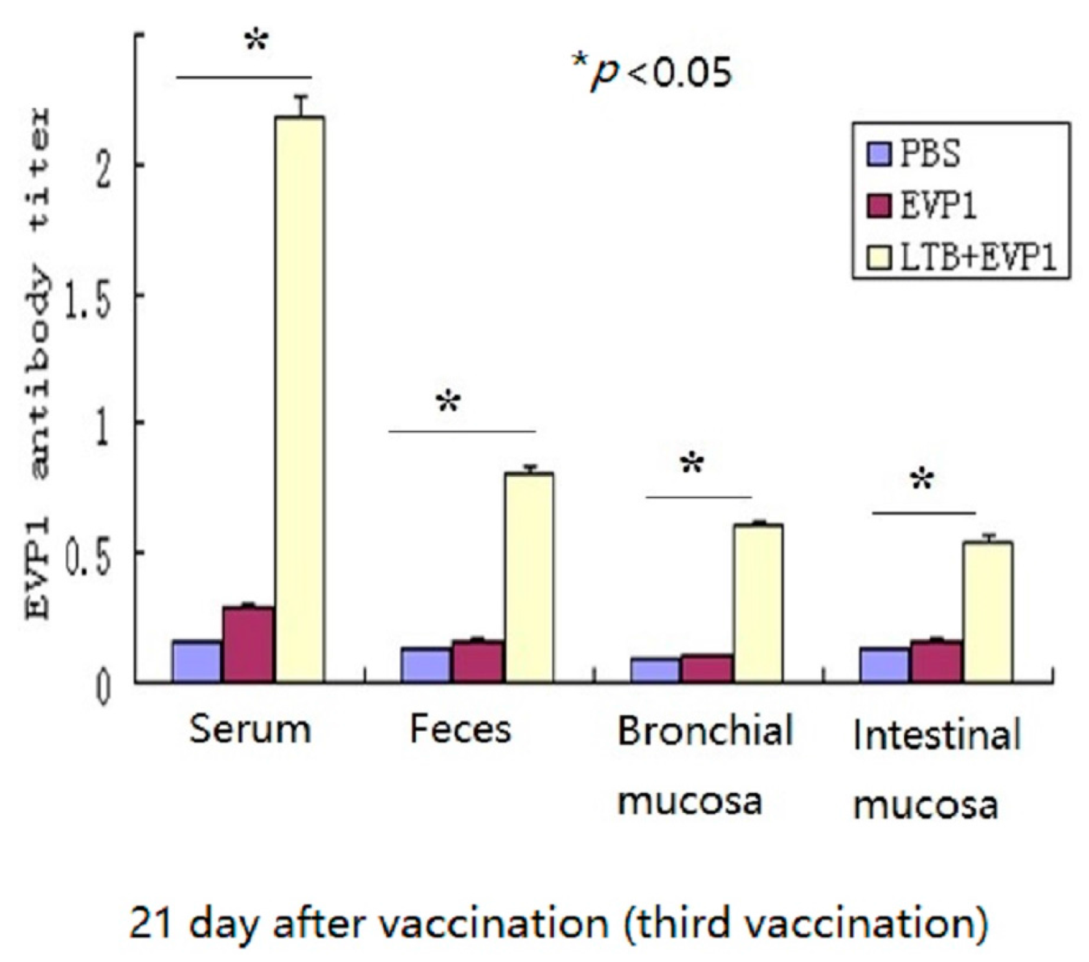 Balb/c mice of 3–4 weeks (male) were bred in the experimental animal center (Chongqing Medical University, Chongqing, China) and divided into four groups. Six mice were included in each group that is, LTB, EVP1, LTB + EVP1, and PBS. After anesthetizing with chloral hydrate (0.5 mL/100 g), the mice were intranasally vaccinated three times on day 0, 7, and 14 with 10–20 µL of LTB (10 µg/mouse), EVP1 (10 µg/mouse), LTB+EVP1 (20 µg/mouse), and PBS. This study was carried out in strict accordance with the recommendations in the Guide for the Care and Use of Laboratory Animals of the National Institutes of Health. The protocol was approved by the Committee on the Ethics of Animal Experiments at the Chongqing Medical University (SYXK2012-0001, 2013-03-11). All surgery was performed under sodium pentobarbital anesthesia, and euthanized by cervical dislocation.