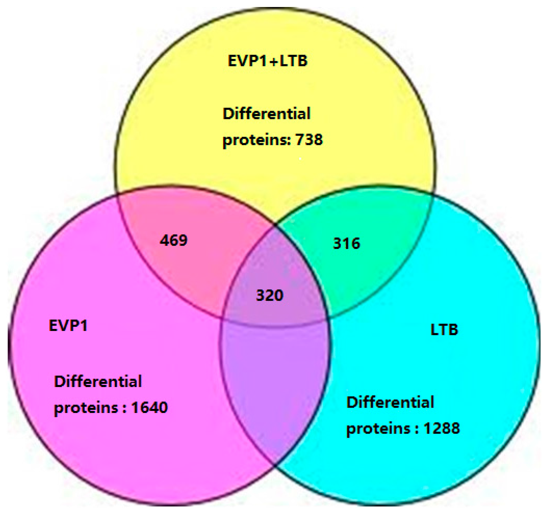 A total of 4748 unique proteins were identified with 95% confidence by the ProteinPilot search algorithm against the IPI (international protein index) mouse protein database v3.49. In order to evaluate as many differential expression proteins as possible, a strict cutoff value of a ≥1.50-fold or ≤0.5-fold change resulted in a final set of 3666 differential proteins in three groups. Among of them, 1288 differential proteins were identified in group LTB (p ≤ 0.05); 1640 differential proteins in group EVP1 (p ≤ 0.05); and 738 differential proteins in group LTB plus EVP1 treatment (p ≤ 0.05), respectively (Figure 2). The group LTB and group EVP1 had 1040 overlapping differential proteins, the group LTB and group LTB plus EVP1 had 316 overlapping differential proteins, and the group EVP1 and group LTB plus EVP1 had 469 overlapping differential proteins. There were 320 differential proteins overlapping among the three groups (Figure 2). The results indicated that the LTB (mucosal adjuvant) and EVP1 (antigen) coaction resulted in the reduction of the total differential protein expression in mø264.7.