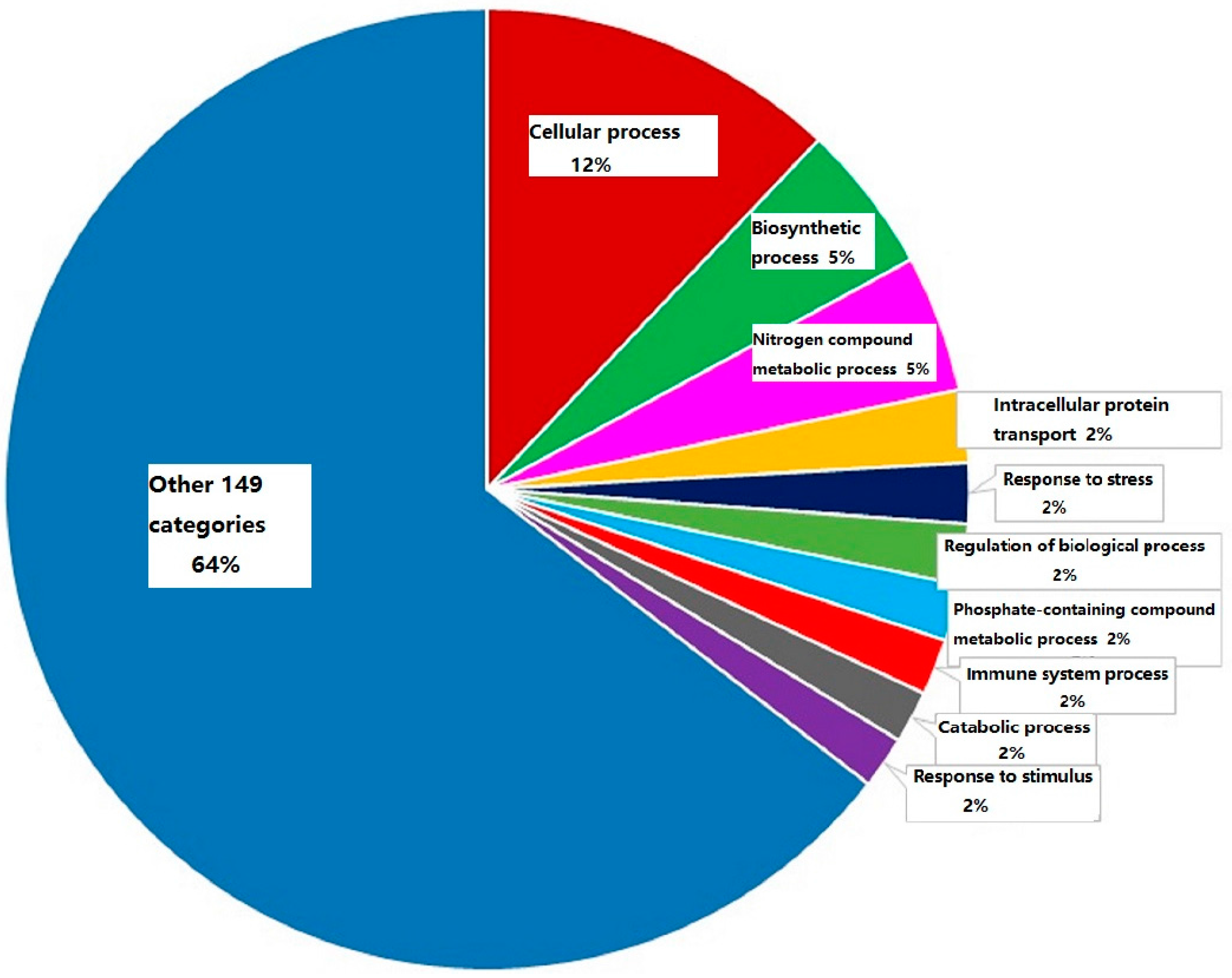 A functional classification of 738 differential expression proteins in group LTB plus EVP1 was analyzed with a PANTHER tool according to the biological process with the most significance. One hundred and fifty-nine categories were observed. Among of them, the immune system processing proteins were only 1.9% in LTB plus EVP1 treatment. The category with the highest percentage of genes was cellular process (12.5%), followed by biosynthetic process (5.2%), nitrogen compound metabolic process (4.8%), intracellular protein transport (2.5%), response to stress (2.1%), regulation of biological process (2.1%), phosphate-containing compound metabolic process (2.0%), catabolic process (1.8%), and response to stimulus (1.8%), respectively (Figure 3).