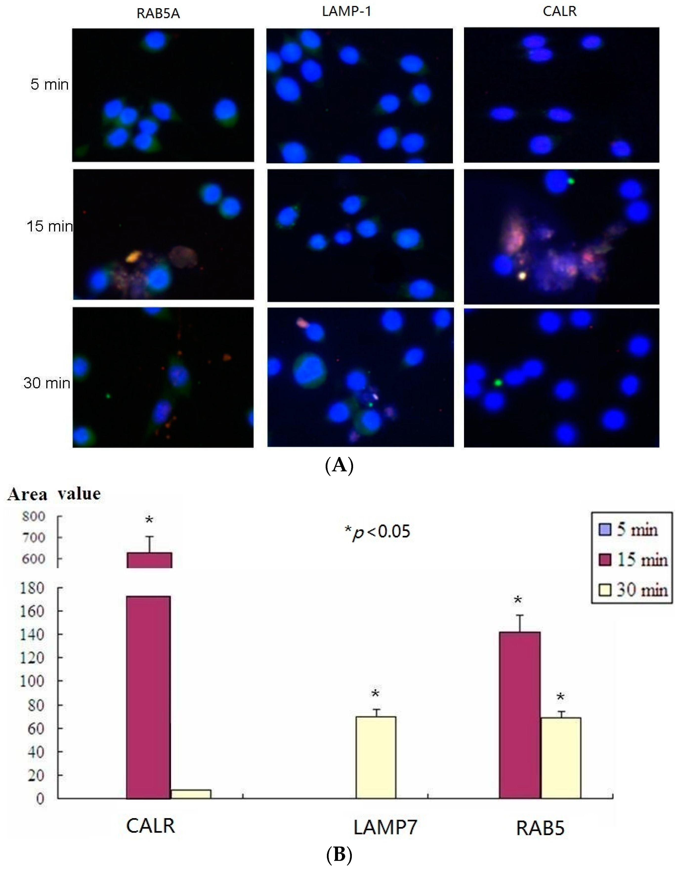 Results of confocal microscopy assay. (A) mø264.7 cells were treated with LTB and fixed at 5, 15, or 30 min, respectively. After penetration of 0.5% Triton-X 100, the samples were blocked with 10% BSA/PBS and incubated with the rabbit-anti-RAB5A, rabbit-anti-LAMP-1, rabbit-anti-CALR, and mouse-anti-His-tag. Then the samples were incubated with secondary DyLight 488 labeled goat anti-rabbit IgG and Cy3 labeled goat anti-mouse IgG to detect the RAB5A, LAMP-1, CALR (green) and LTB (red), respectively. Images were taken using a confocal laser scanning microscope (FluoView1000, Olympus, Tokyo, Japan) with a 20× objective using the sequential scanning mode (200×) and processed using the FluoView software (Olympus); and (B) Quantitative analysis of microscopy images (* p < 0.05).