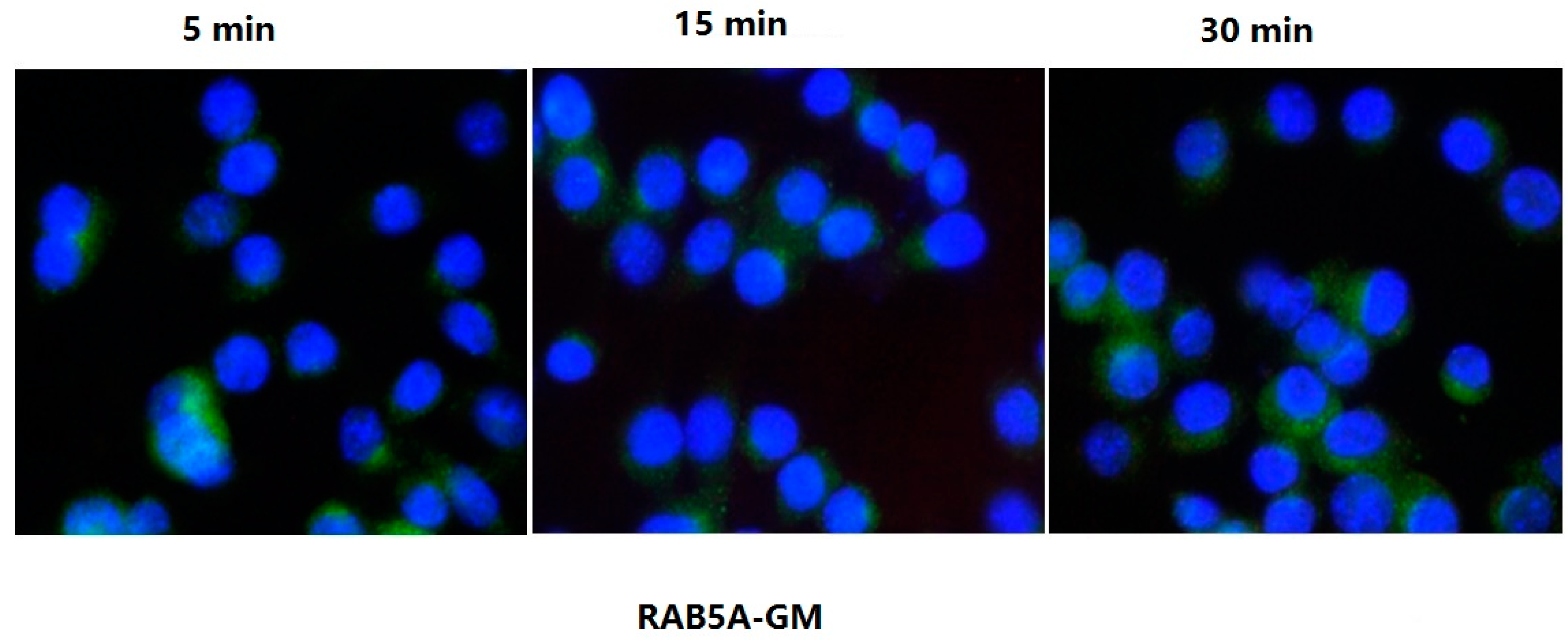 The results of LTB inhibition analysis showed that LTB did not colocalize with RAB5A in early endosomes from 5 to 30 min after being treated with soluble GM (ganglioside M1), a typical LT inhibitor (Figure 5). Therefore, the endocytosis of LTB was completely inhibited by GM.