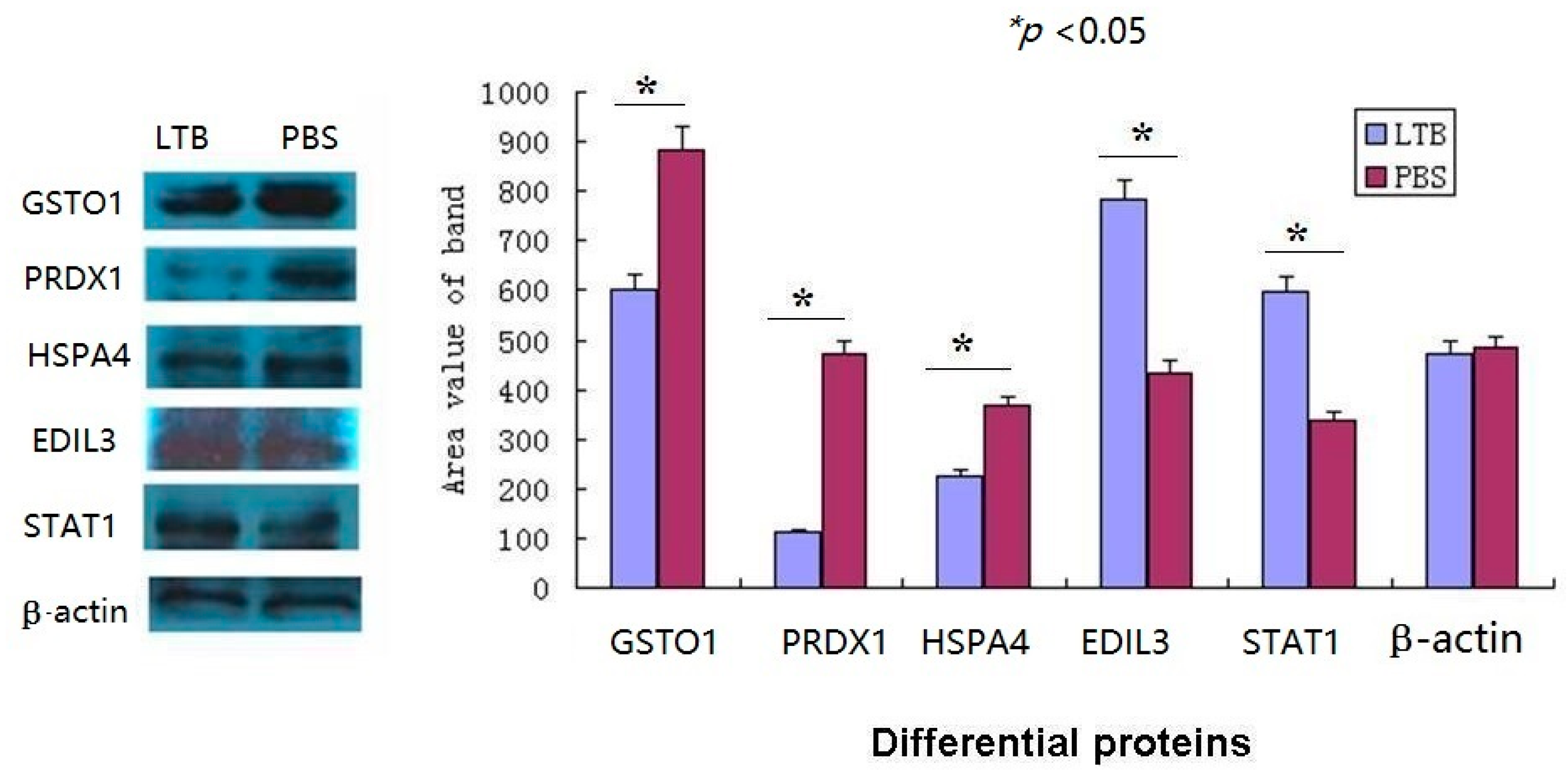 Western blot analysis of some differential proteins. The target proteins of LTB treated mouse mø264.7 was expressed in line with the trend of iTRAQ-MS analysis results. The area value of protein bands was measured by Image-pro plus tools and the proteins change significantly (* p < 0.05). More than three biological replicates were performed.