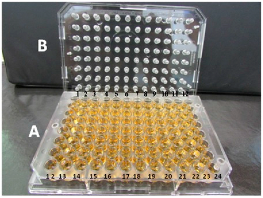 (A) Plate containing TSB with 2% glucose used for biofilm formation, cell recovery, and determination of MIC and MBCB; (B) Lid with pins for formation of staphylococcal biofilms.