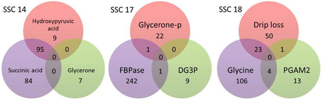 Overlapping SNPs at Sus scrofa chromosomes (SSC) 14, 17 and 18. GWAS procedures resulted in varying numbers of significant SNP (q ≤ 0.1) per trait. On some chromosomes there are overlapping SNPs with meaning for two traits. Drip loss measured in Musculus longissimus dorsi (LD) 24 h post-mortem (p.m.); Glycerone-p = dihydroxyacetone phosphate; PGAM2 = phosphoglycerate mutase 2 (muscle); FBPase = fructose-1,6-bisphosphatase 2; DG3P = d-glycerate-3-phosphate.