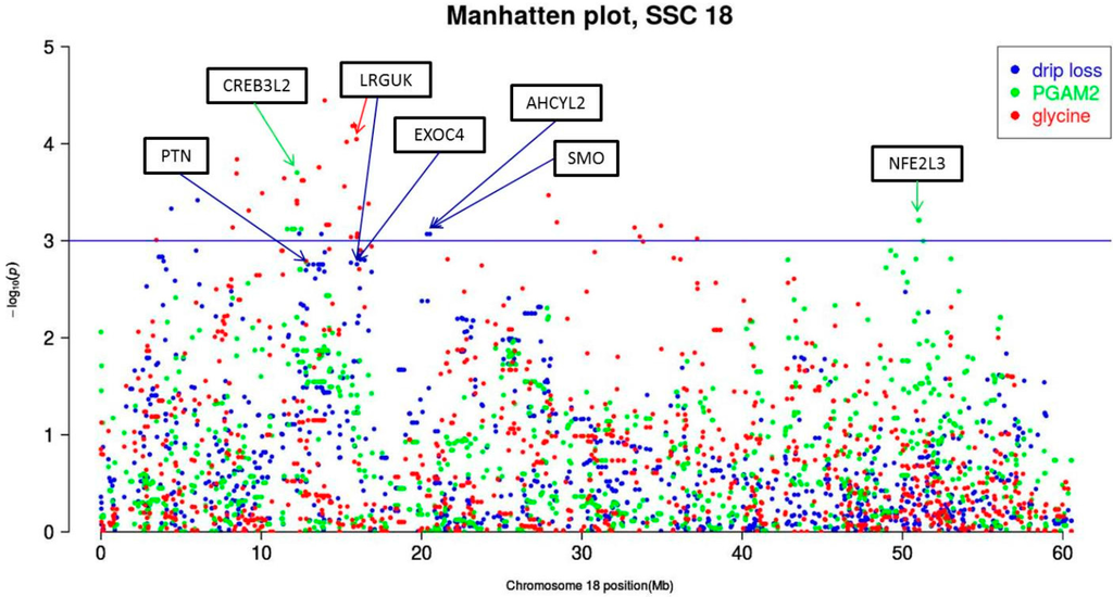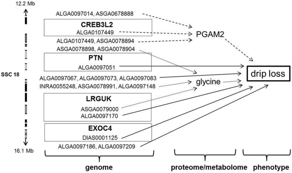 In this context, Picard et al. [] and van der Sijde et al. [] have stated that there is an increasing interest to combine all the omic levels in a holistic omics approach to investigate the complexity of the molecular events beyond expected biological functions and to identify important genes. It can be expected that meat quality traits are influenced by a high number of interacting genes that are unknown or involved in unexpected functions, so that the across omics level approach used in our study is particularly useful. Based on the described integrated analysis of the omic levels genome, proteome, metabolome and phenotype, we increased the information density between genes and trait of interest to decode the complex biological mechanisms influencing drip loss and to reveal promising candidate genes. At least some of these genes have not been detected based on a standard GWAS procedure. The most promising candidate genes were located on SSC 18 where we detected several, partly overlapping QTL for drip loss itself and the intermediate phenotypes PGAM2 and glycine. These candidate genes need further investigations to identify underlying functional mutations affecting drip loss and the related metabolic processes.