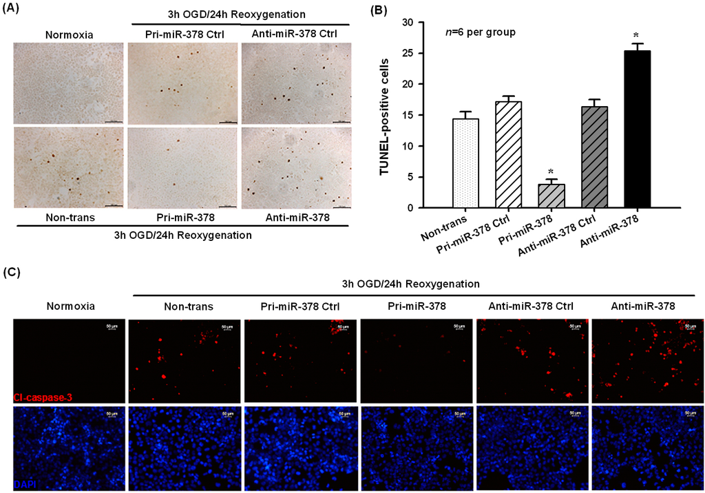 To determine the role of miR-378 in OGD-induced cell injury, we used pri-miR-378 and anti-miR-378 to alter miR-378 levels in cultured N2A cells. As shown in Figure 1B, transfection of pri-miR-378 or anti-miR-378, but not their negative controls, significantly increased or decreased miR-378 levels in normoxia and 3 h OGD followed by 24 h reoxygenation (p < 0.05, n = 5 per group). Later, methylthiazolyldiphenyl-tetrazolium bromide (MTT) and lactate dehydrogenase (LDH) assays were employed to evaluate the effect of miR-378 on OGD-induced cell survival and cell death, respectively. 3 h OGD/24 h reoxygenation resulted in obvious N2A cell death. Overexpression of miR-378 substantially suppressed the cell death, whereas transfection of anti-miR-378 aggravated the N2A cell death induced by 3 h OGD/24 h reoxygenation (Figure 1C–F, p < 0.05, n = 6 per group). To confirm whether miR-378 could affect 3 h OGD/24 h reoxygenation-induced N2A cell apoptosis, a TUNEL assay was performed. TUNEL-positive cells were rarely seen in the normoxic group, whereas 3 h OGD/24 h reoxygenation increased the number of TUNEL-positive cells. Transfection of pri-miR-378 could significantly attenuate, while anti-miR-378 enhanced the number of TUNEL-positive cells. (Figure 2A,B, p < 0.05, n = 6 per group). As we know that TUNEL-positive cells also include some necroptotic cells, we further examined the activation of caspase-3 using a cleaved-caspase-3 specific antibody. The results confirmed that transfection of pri-miR-378 attenuated 3 h OGD/24 h reoxygenation induced cell apoptosis, while anti-miR-378 aggravated 3 h OGD/24 h reoxygenation induced cell apoptosis (Figure 2C).