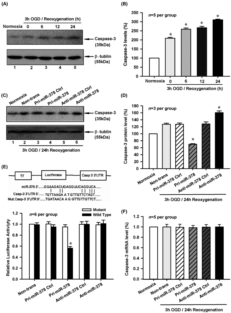 As described by the previous report, miR-378 could inhibit caspase-3 protein expression and attenuated ischemic injury in cardiomyocytes []. To examine whether caspase-3 is responsible for OGD-induced N2A cell apoptosis, we analyzed the possibility of caspase-3 being a putative target of miR-378 by bioinformatics algorithms. We found that there were potential binding sites between mmu-miR-378 and the 3′-UTR of Caspase-3 mRNA. In partial agreement with this prediction, we found that caspase-3 protein levels increased significantly in N2A cells at 0–24 h of reoxygenation after 3 h of OGD (Figure 3A,B, p < 0.05, n = 5 per group). In addition, pri-miR-378 effectively decreased the expression of caspase-3, whereas anti-miR-378 increased the expression of caspase-3 in mouse N2A cells exposed to 3 h OGD/24 h reoxygenation (Figure 3C,D, p < 0.05, n = 3 per group). However, pri-miR-378 and anti-miR-378 had no effect on Caspase-3 mRNA levels (Figure 3F, p < 0.05, n = 5 per group).