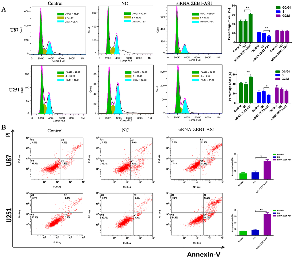 Effects of lncRNA ZEB1-AS1 on glioma cell cycle and apoptosis were analyzed by flow cytometry. (A) Cell cycle analysis showed that the silencing of ZEB1-AS1 greatly induced the G0/G1 phase arrest and correspondingly decreased the percentage of S phase cells; (B) Annexin V/PI (propidium iodide) staining and flow cytometry analysis showed that ZEB1-AS1 knockdown in U87 and U251 cells dramatically enhanced the cell apoptosis rate compared with NC groups. * p < 0.05, ** p < 0.01.