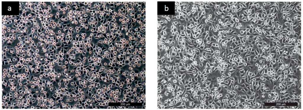 - To reveal the ability of cells to adhere to the surfaces, the cells were seeded on reference culture dishes (TPP, Trasadingen, Switzerland) and the studied polymer films at a concentration of 1 × 107 cells·mL−1. After one hour, the cells were gently rinsed and micrographs were taken.