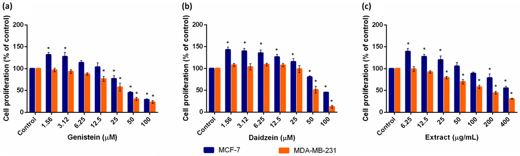 Effects of (a) genistein (Gen), (b) daidzein (Dai) and (c) a soy seed extract (Ext) on the proliferation of MCF-7 and MDA-MB-231 cells evaluated using the 3-(4,5-dimethylthiazol-2-yl)-2,5-diphenyltetrazolium bromide (MTT) assay. Cells were exposed to the indicated concentrations of test compounds for 72 h. Control cells were exposed only to solvent (Dimethyl sulfoxide (DMSO) 0.4%). Results were expressed as a percentage of the solvent control (set as 100%) and represented as the mean ± standard deviation (SD) of four independent experiments; * p < 0.001 compared to the corresponding control according to one-way analysis of variance (ANOVA) test followed by Dunnett’s multiple-comparison test.
