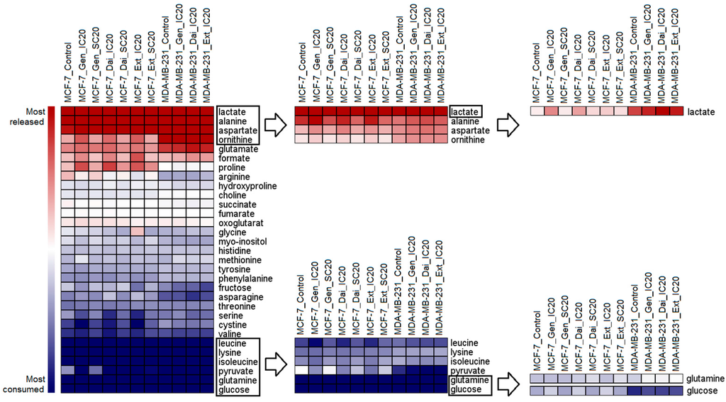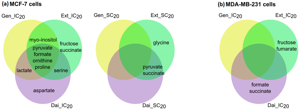 For MDA-MB-231 cells, no significant alteration was seen following Gen treatment (IC20), but a decrease in glucose and glutamine consumption was observed. IC20 of Ext and Dai induced distinct changes that partially superposed with the exometabolome changes that occurred in MCF-7 cells after exposure to the same test concentrations. Thus, it is possible that similar molecular mechanisms trigger cell inhibition in both cell lines.