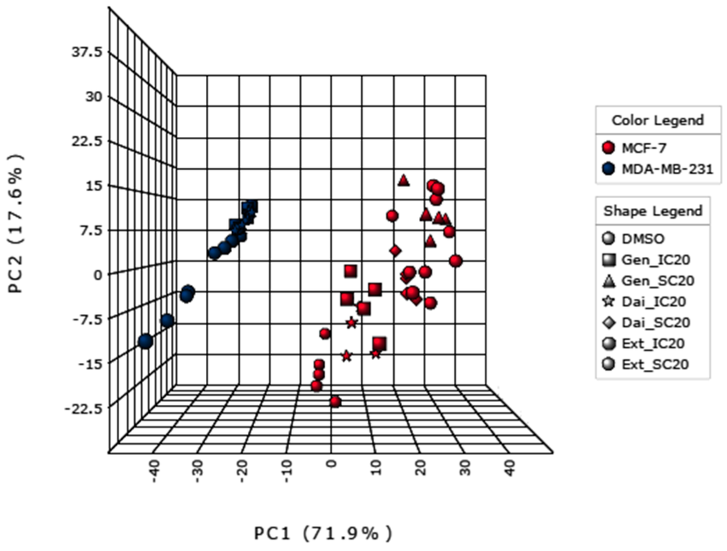 For this purpose, we designed a global metabolomic study to compare the metabolome of two different breast cancer cell lines, MCF-7 and MDA-MB-231, in response to genistein (Gen), daidzein (Dai) and a soy seed extract (Ext). MCF-7 are low invasive, estrogen-responsive cells, while MDA-MB-231 are high invasive, estrogen non-responsive breast cancer cells. Given that soy isoflavones display dose-dependent effects, we selected, for all of our compounds, concentrations that led to a 20% inhibition of cell growth compared to control (IC20) and to a 20% stimulation of cell growth compared to control (SC20), respectively. To our knowledge, this is the first study to use specific concentrations for each test compound in order to obtain comparable effects. This subject is highly significant as isoflavones have different binding capacities and potencies [].