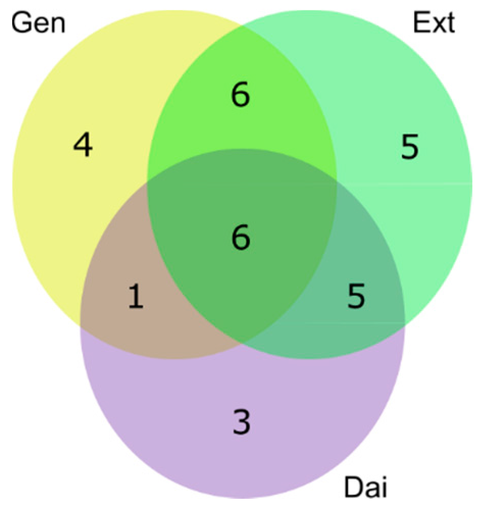 Venn-diagram presenting the number (1–6) of the unique and shared intracellular metabolites that were significantly changed after exposing MCF-7 cells to Gen (yellow spot), Dai (purple spot) and Ext (green spot). Significantly-changed metabolites were selected based on a multiple t-test (α = 0.01) and an FC threshold of 1.5 (see Table S2).
