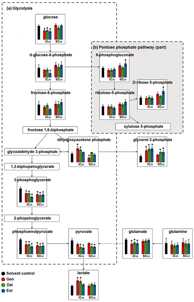 In the first approach, we compared the metabolic effects induced by the test compounds individually, without regard to the test concentration. By selecting all significantly-changed metabolites following Gen, Dai or Ext treatment, at both low (SC20) and high (IC20) doses, we generated specific metabolite sets for each test compound, which covered a wide range of exposure doses. Moreover, using this approach, we were able to identify the shared and unique metabolite patterns between test compounds and to predict the similar and the specific altered pathways (Figure 5).