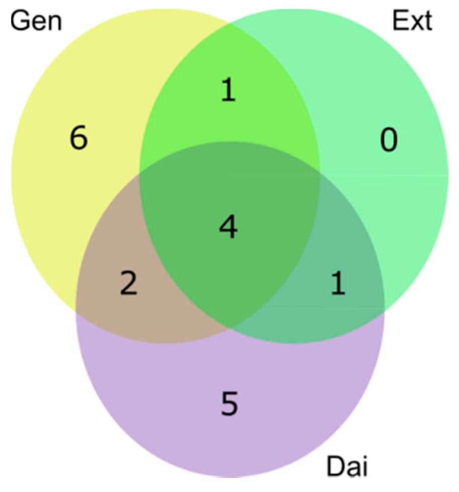 A Venn-diagram presenting the number (1–6) of the unique and shared intracellular metabolites that were significantly changed after exposing MDA-MB-231 cells to Gen (yellow spot), Dai (purple spot) and Ext (green spot). Significantly-changed metabolites were selected based on a multiple t-test (α = 0.01) and an FC threshold of 1.5 (see Table S2).