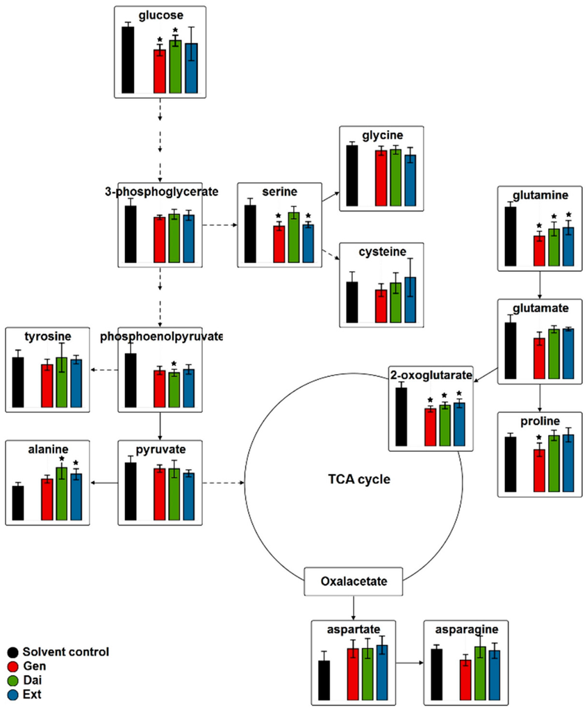 After isoflavone treatment, the concentration of asparagine, cysteine, glutamate, glutamine, glycine, proline, serine and tyrosine generally decreased, while the concentration of alanine and aspartate increased. Although the biosynthesis of these non-essential amino acids is different, their carbon skeletons are derived from the intermediates of common pathways, namely glycolysis, the citric acid cycle or glutaminolysis.