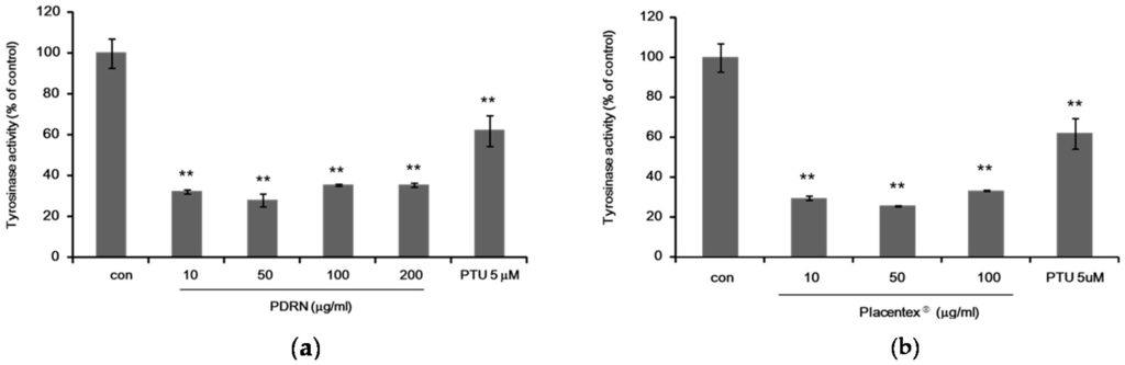 Tyrosinase activity in Mel-Ab cells treated with PDRN or Placentex® was examined by an intracellular tyrosinase assay. Mel-Ab cells were incubated with 10–200 μg/mL of PDRN or 10–100 μg/mL of Placentex® for 4 days. N′-phenylthiourea (PTU, 5 μM) was used as a positive control. The results showed that both PDRN and Placentex® reduced intracellular tyrosinase activity in Mel-Ab cells (Figure 2a,b).