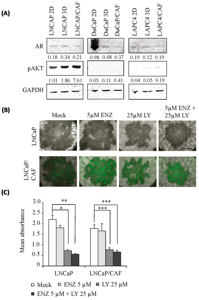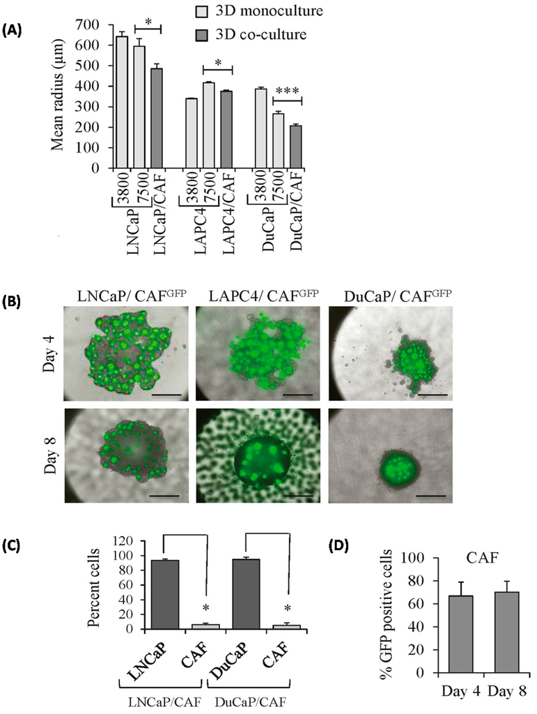 2.1. Growth Characteristics of LNCaP, DuCaP, and LAPC4 3D Spheroids in the Absence or Presence of Cancer-Associated Fibroblasts (CAFs)