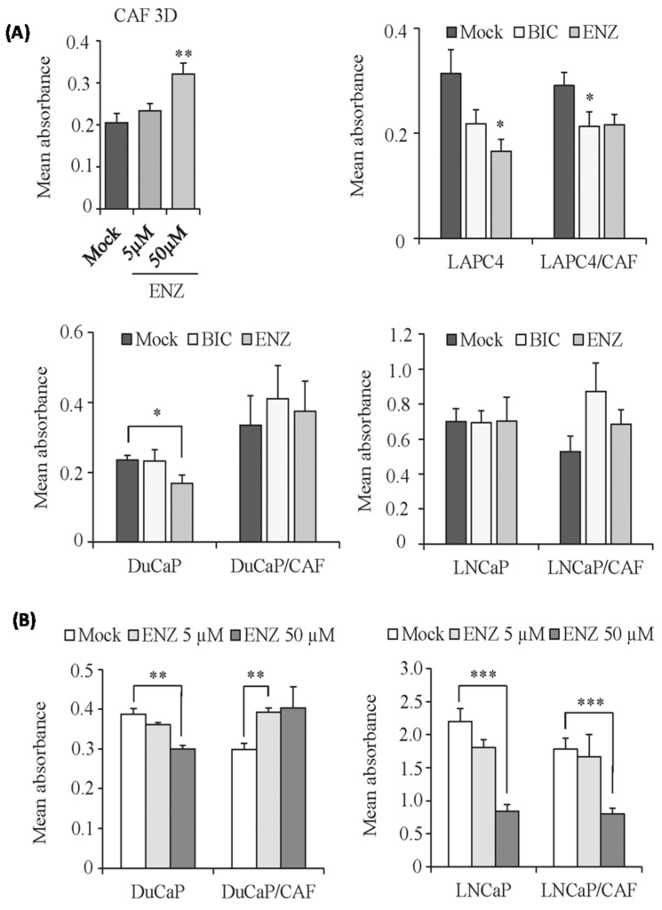2.4. Modified Response of PCa/CAF Co-Culture Spheroids to Anti-Androgens