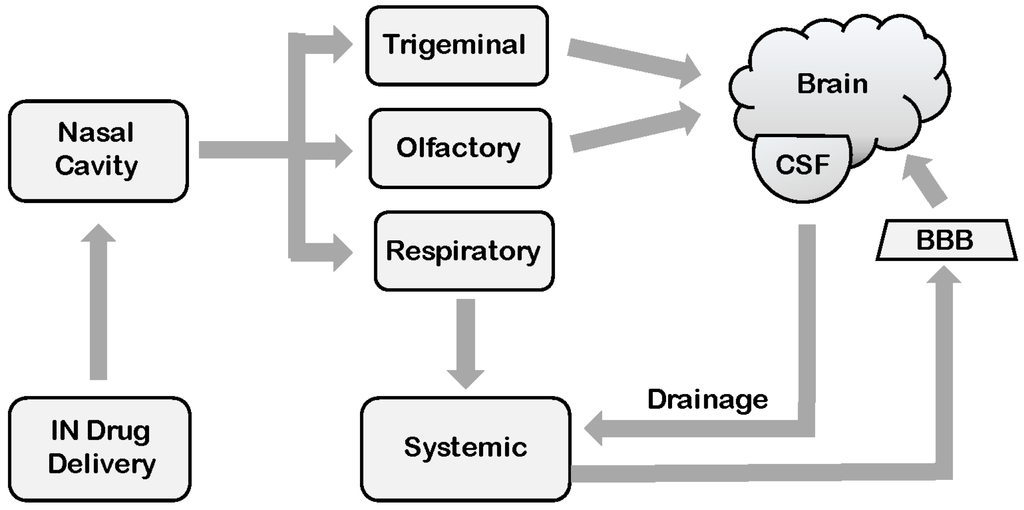 One of the intensely-investigated aspects of intranasal delivery is the objective to deliver pharmaceutical agents directly from the nose to the brain. Direct nose-to-brain transport is based on the idea that this route of drug delivery would circumvent, rather than cross, the BBB, resulting in enhanced access of drugs to the intracranial lesion. It thus may offer an attractive alternative, or addition, to drug delivery via the systemic circulation across the BBB, in particular for those drugs with little or no BBB penetration. Altogether, the combination of direct nose-to-brain transport together with mucosal uptake is envisioned to further support accelerated drug uptake, greater bioavailability, as well as rapid onset of drug action in the brain [,,,,].