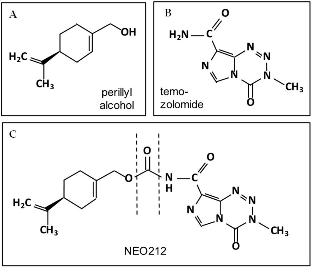 Chemical Structures. Shown are the chemical structures of (A) the monoterpene perillyl alcohol and (B) the imidazotetrazine temozolomide; (C) shows NEO212 (perillyl alcohol conjugated to temozolomide), with the two components covalently conjugated via a carbamate bridge (between dashed lines).