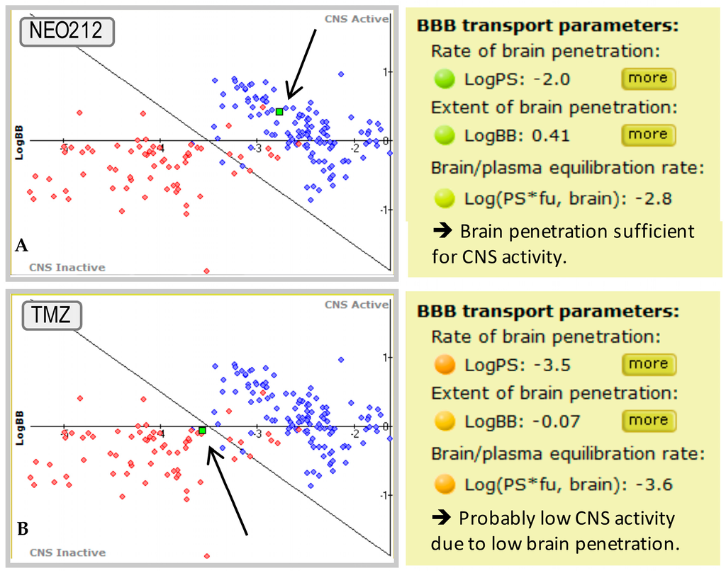 Central nervous system (CNS) activity plot using ACD/Lab’s BBB Penetration Module software (Advanced Chemistry Development, Inc.; Toronto, ON, Canada). Arrows point to the test compound (green dot) in each panel, i.e., NEO212 (A) and temozolomide (TMZ, B), respectively. Blue dots represent 73 well-characterized CNS-active drugs. Red dots represent 62 known peripherally-acting drugs with little or no brain activity. As shown, NEO212 (A) is located well within the cluster of brain-active compounds, whereas TMZ (B) is located borderline; in agreement with its known ability to only suboptimally (20%) penetrate the BBB. Y-axis: LogBB; X-axis: LogPS × fu, brain. Note the colored circles in the yellow data squares to the right: green color highlights values that are supportive of brain activity, orange signifies borderline values, and red color indicates values that are not supportive of brain activity.