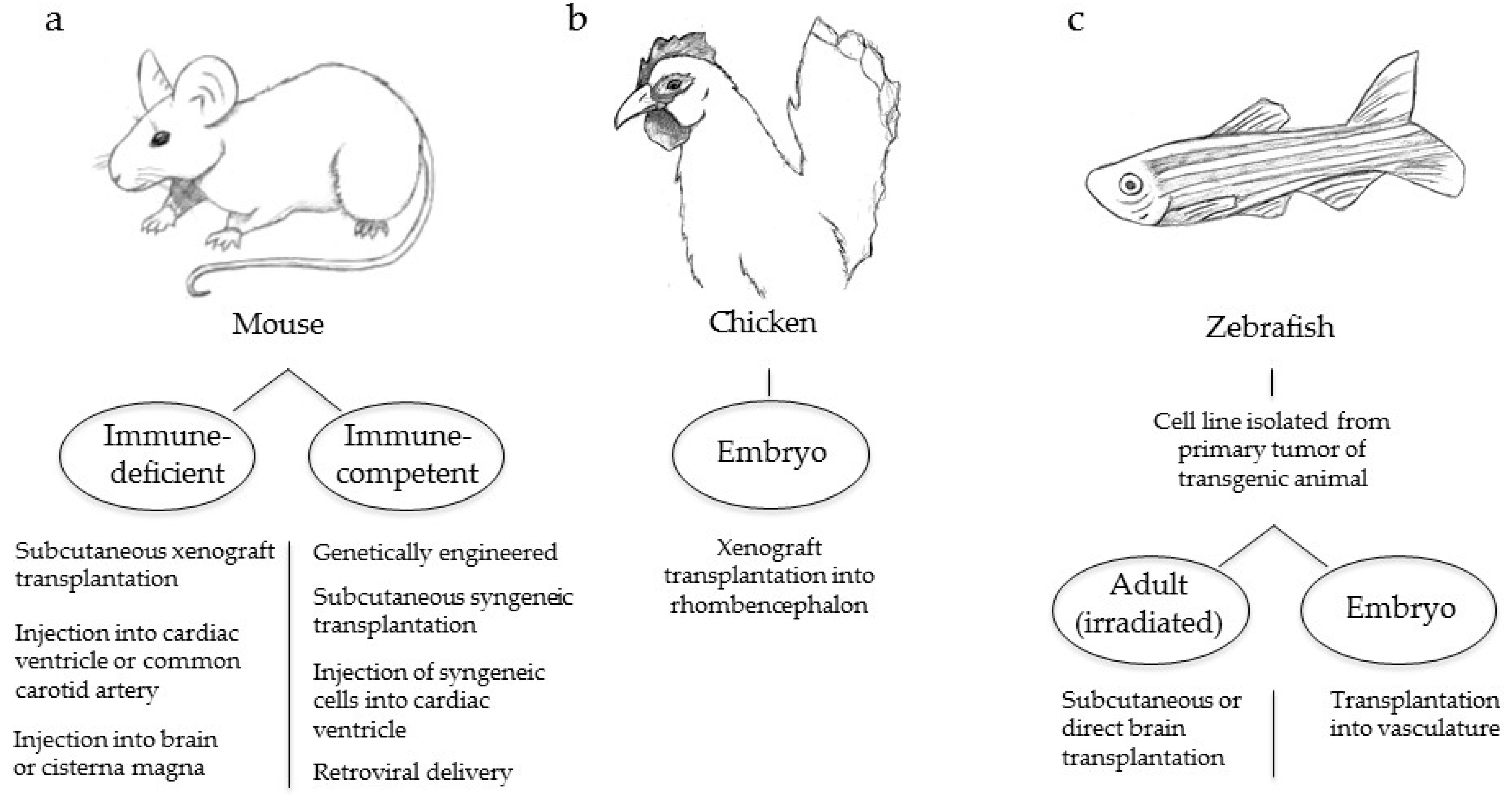 Animal models used to investigate melanoma brain metastasis. (a) Immunodeficient and immunocompetent mouse models; (b) Chicken embryo model; (c) Zebrafish adult and embryo models.