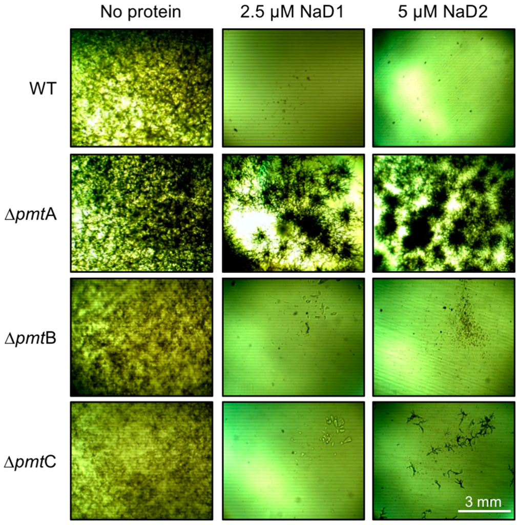 Disruption of the main O-mannosyltransferase in A. nidulans, An∆pmtA, led to enhanced resistance to both NaD1 and NaD2, compared to the WT, An strain A850 (Figure 1). A limited amount of growth of the O-mannosyltransferase C mutant, An∆pmtC, was observed in the presence of NaD2, but not with NaD1. In all experiments, the sensitivity of the O-mannosyltransferase B KO mutant, An∆pmtB, closely resembled that of the WT. All knockout mutants grew as per the wild type strain in the absence of defensins (Figure 1).