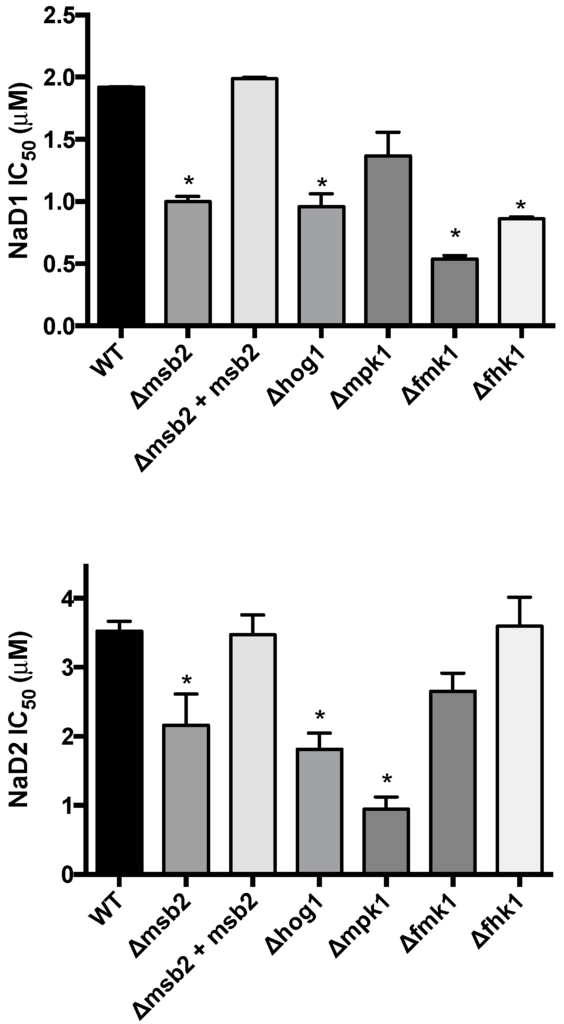 Concentrations of the plant defensins, NaD1 and NaD2, required to inhibit 50% growth (IC50) of Fusarium oxysporum f. sp. lycopersici knock out mutants of the mitogen-activated protein kinase (MAPK) pathways. Error bars are SEM, NaD1 n = 3, NaD2 n = 6. * indicates data that is significantly different (p < 0.05) to WT.