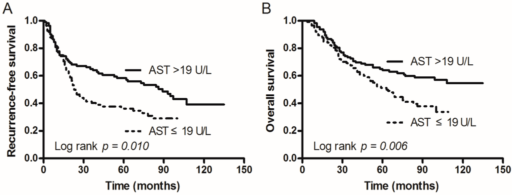 Kaplan–Meier survival curves of non-small cell lung cancer (NSCLC) patients were divided into two groups (AST > 19 U/L and AST ≤ 19 U/L). (A) Recurrence-free survival (RFS) of patients with AST. The survival of patients with AST ≤ 19 U/L was shorter than that of patients with AST > 19 U/L (p = 0.010); (B) Overall survival (OS) of patients with AST. The survival of patients with AST ≤ 19 U/L was also shorter than that of patients with AST > 19 U/L (p = 0.006). AST: aspartate aminotransferase.